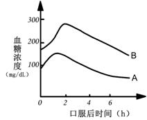 (5分)正常人血糖浓度的范围是80~120mg/dL,糖尿病人的血糖浓度高于正常值。图中的两条曲线分别表示A、B两人在口服葡萄糖后血糖浓度的变化情况。请分析回答下列问题: