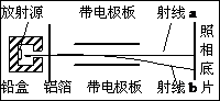 (4分)一置于铅盒中的放射源发射的a、b 和g 射线,由铅盒的小孔射出,在小孔外放一铝箔后,铝箔后的空间有一匀强电场。进入电场后,射线变为a、b两束,射线a沿原来方向行进,射线b发生了偏转,如图所示,则图中的射线a为__________射线,射线b为_______________射线。