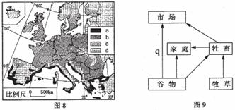 图8为欧洲四种农业地域类型分布图,图9是该区域某种农业地域类型的经营方式示意图。读图回答14-16题。