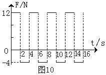 14.一个质量为4kg的物体静止在足够大的水平地面上,物体与地面间的动摩擦因数。从t=0开始,物体受到一个大小和方向呈周期性变化的水平力F作用,力F随时间的变化规律如图10所示。求83秒内物体的位移大小和力F对物体所做的功。g取