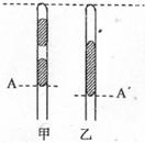 11.竖直放置、粗细均匀的玻璃管!上端封闭,下端开口。甲图中气体被水银封闭且隔成两段。现轻弹玻璃管,使两端水银柱合在一起,变成乙图所示状态,设此过程中不漏气、且温度不变,则甲、乙中水银面下端A和A’相比较
