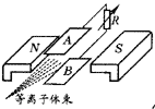 24.磁流体发电是一项新兴技术,它可以把气体的内能直接转化为电能,图3-65是磁流体发电机的装置:A、B组成一对平行电极,两极间距为d,内有磁感强度为B的匀强磁场,现持续将一束等离子体(即高温下电离的气体,含有大量带正电和带负电的微粒,而从整体来说呈中性)垂直喷射入磁场,每个离子的速度为v,电量大小为q,忽略两极之间等效内阻,稳定时,电势较高的是____________极,磁流体发电机的电动势E=____________,外电路电阻为R,则R所消耗的功率为P=____________.