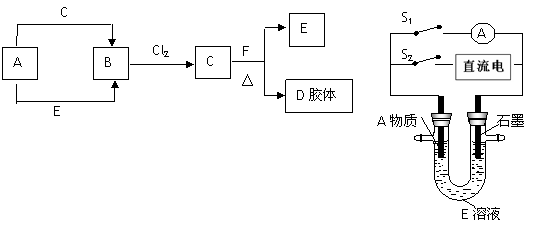 (4)将适量E的水溶液注入右上图所示装置的U形管中,分别用A物质和石墨做电极并将电极插入溶液中。