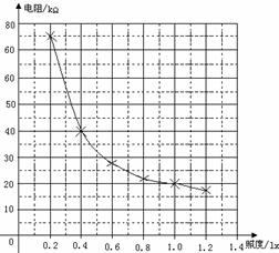 ①根据表中数据,请在给定的坐标系(见答题卡)中描绘出阻值随照度变化的曲线,并说明阻值随照度变化的特点。