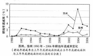 (2)1990年至2006年两地耕地面积总体呈减少的趋势;苏州面积减少快,徐州耕地面积减少相对缓慢。