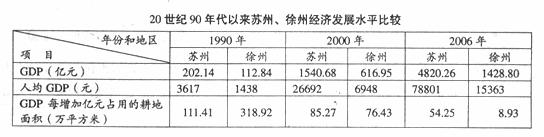 (3)读“20世纪90年代以来苏州、徐州经济发展水平比较’’表,比较两地“GDP”和“GDP每增加亿元占用的耕地面积”变化的共同性和差异性。