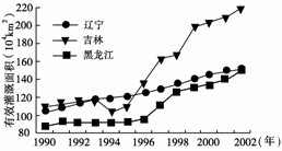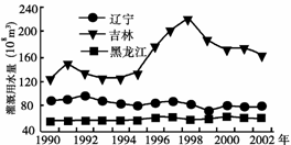 图一 1990-2002年东北三省有效灌溉面积变化图 图二 1990-2002年东北三省灌溉用水量变化图