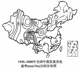 (08广东29-30)年蒸发量变化速率指标能够反映蒸发量的时间变化。如“-40mm/10a”表示年蒸发量10年间减少了40毫米。读图,结合相关知识回答3-4题。