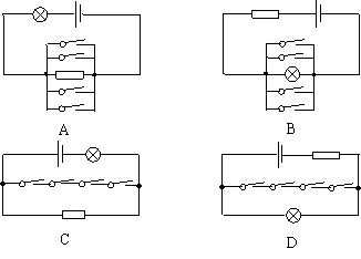 5、小轿车的仪表盘上,有一个显示汽车车门关闭状况的指示灯。只要四个车门中有一个没关闭(此时装在车门上的电路开关处于断开),指示灯就发光提醒。下面四个电路中,能体现该装置工作原理的是