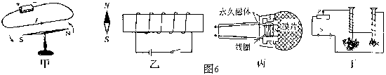 B.乙:闭合开关,小磁针N极向左偏转