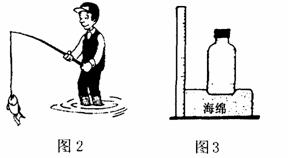 A.鱼线的拉 B.瓶对海绵 C.球拍对球 D.脚踢球使球飞出