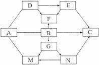 27.(09南京)(6分)框图中的物质为初中化学所学的物质,其叫属于盐的是B、C、M、N,属于氧化物的是F、G;胃液中含有适量的A,可帮助消化;C是家庭中重要的调味品之-一;D常用于改良酸性土壤。图中“---.”表示两端的物质问能发生化学反应:“→’表示物质间存在转化关系;部分反应物或生成物已略去。