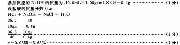 (2)请根据上图找出氢氧化钠与盐酸恰好完全反应时,所滴加氢氧化钠溶液的体积数,并据此计算此瓶盐酸的溶质质量分数。(氢氧化钠溶液的密度按1.0g/mL计算)