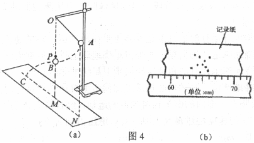 .如图4(a)中,悬点正下方P点处放有水平放置炽热的电热丝,当悬线摆至电热丝处时能轻易被烧断,小球由于惯性向前飞出作平抛运动.在地面上放上白纸,上面覆盖着复写纸,当小球落在复写纸上时,会在下面白纸上留下痕迹.用重锤线确定出A、B点的投影点N、M重复实验10次(小球每一次都从同一点由静止释放),球的落点痕迹如图4(b)所示,图中米尺水平放置,零刻度线与M点对齐.用米尺量出AN的高度h1、BM的高度h2,算出A、B两点的竖直距离,再量出M,C之间的距离x,即可验证机械能守恒定律.己知重力加速度为g,小球的质量为m.