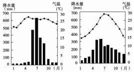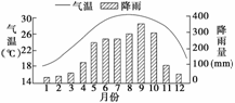 解析 从气温数值看,一年内最低气温接近18℃,最高气温30℃,气温年较差较小;从降水量柱高看,年内分配不均匀,主要集中在气温高的夏季。