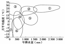 (04广东1-4)下图表示气温、降水与气候类型的关系。读图回答8-11题。