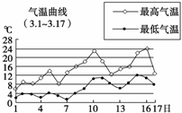 (04上海11-15)“春天孩儿面,一日三朝变”。请参阅“今年3月1日至17日上海地区气温曲线图” ,回答12-16题。