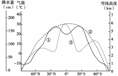 解析 调动已学的地理基础知识,对①②③进行比较分析、判断。气温分布主要取决于接受太阳热量的多少,从低纬向高纬降低。而降水主要取决于大气环流形势,因此副热带地区气流下沉,降水稀少;赤道地区气流上升,降水最多。多年平均雪线高度与气温、降水关系密切,气温高,雪线高;降水少,雪线高。副热带地区降水少,气温高,因此雪线高。根据以上分析①为多年平均雪线高度,②为气温,③为降水量。