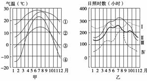 解析 甲图气温曲线与乙图中日照曲线组合中,①与Ⅱ,②与Ⅳ,③与Ⅰ,④与Ⅲ组合正确。