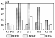 (05北京1-2)2005年4月28-30日,华北地区经历了一次沙尘天气,造成许多地方空气污染指数(API)增高,主要污染物是可吸入颗粒物。读图回答15-16题。