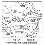 (1)在多年平均情况下,福州梅雨起始日是 ,徐州梅雨终止日是 。
