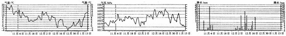 13.(08宜昌调研)读“杭州2001年10月23日-2002年1月15日最低气温曲线、气压曲线和降水柱状图”,完成下列问题。
