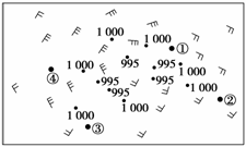 (08哈师大附中模拟)下图中的数值为气压,单位为百帕。据此完成3-4题。