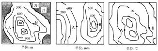 答案 (1)西侧降水较多,东侧降水较少。原因:该地终年受西风带影响,西侧地处迎风坡,降水较多;东侧地处背风坡,降水较少。 (2)分布规律:中间气温低,四周气温高。原因:受地势影响,中间海拔较高,气温较低,四周海拔较低,气温较高。 (3)A点气温低于B点。原因:两点纬度相当,海拔相同,但B点降水较少,晴天较多,故气温相对较高。