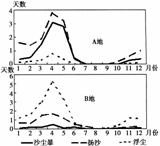 14.读“华北地区A、B两地多年平均沙尘天气日数的逐月分布示意图”。回答下列问题。