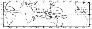 下图为“某天气系统全球发生区域分布图”,该天气系统每年全球发生的总数约80次,图中的数字为不同区域发生的平均次数和占全球的比率。读图,回答1-2题。