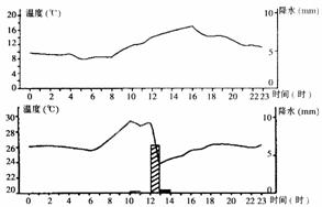 读“某地1月7日(下面上图)和6月9日(下面下图)气温(曲线)和降水(柱状)日变化图”,完成5-6题。