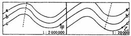 13.下图中等值线为北半球等压线,且a>b>c,则甲、乙两处风向和风力相比正确的是 ( )