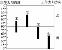 (2007·宁夏文综)我国某校地理兴趣小组的同学,把世界上四地年内正午太阳高度变化及方向绘成简图。回答14-15题?。