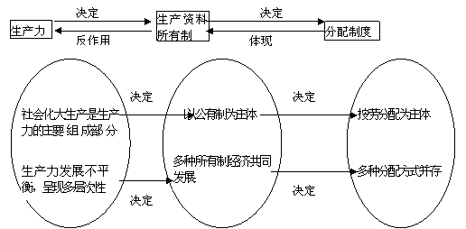 2、我国的基本经济制度 ①是什么? ②这一制度的基本内容P41 A公有制的主体地位,主要体现在:(两个方面) B多种所有制经济共同发展 (多种所有制经济共同发展,就是要继续鼓励和引导各种非公有制经济的发展,依法保护各类企业的合法权益和公平竞争,并对它们进行监督管理。) 3、确立以公有制为主体、多种所有制经济共同发展的基本经济制度的必然性。 ①从根本上说,是由生产关系一定要适应生产力发展的规律决定的(根本原因)。P。42 ②具体说来,是由我国的社会主义性质和初级阶段的国情决定的。P。42-43 ③符合“三个有利于”的原则 ④实践证明,它有利于解放和发展生产力,促进我国的经济建设和社会进步。P。44 4.社会主义的本质和根本任务 (1)社会主义的本质是:…(它包含两个基本方面,即社会主义的根本任务和社会主义的根本目标或目的) (2)社会主义的根本任务和社会主义的根本目的是一致的。只有大力发展生产力,使社会产品极大丰富,才能最终实现共同富裕;而只有实现共同富裕,才能保证生产力的发展符合社会主义的根本目的,保证发展生产力的成果归人民享有。 5.当前非公有制经济的发展与地位作用 ①发展:发展迅速,今后还要继续鼓励非公有制经济的发展。 ②地位:社会主义市场经济的重要组成部分。 ③作用:在国民经济发展中发挥越来越重要的作用。 考点三:我国的分配制度:以按劳分配为主体,多种分配方式并存 1、按劳分配 2、按劳分配以外的收入分配方式①按个体劳动者的劳动成果分配②按生产要素分配(按资本要素分配(存在于混合所有制经济、、按技术信息要素分配(私营经济、外资经济)、按土地要素分配、按劳动力要素分配(私营、外资经济))③福利性分配和社会保障收入(国有经济、集体经济) 3、社会主义把按劳分配和按生产要素分配结合起来的必然性 4.确立各种生产要素按贡献参与分配的原则 确立这一原则是发展社会主义市场经济的客观要求。在市场经济条件下,劳动、资本、土地、技术和管理等生产要素在经济活动中各自发挥着相互不可替代的作用。确立生产要素按贡献参与分配的原则,才能调动广大劳动者、科技人员和管理工作者的积极性和创造性,激励人们更有效地使用生产要素,提高生产要素的利用效率,实现资源的优化配置。让一切劳动、知识、技术、管理和资本的活力竞相进发,让一切创造财富的源泉充分涌流,以造福于人民,造福于社会。 5.基本经济制度和分配制度的关系 区别:含义不同 联系:基本经济制度与分配制度都属于生产关系范畴,基本经济制度决定分配制度。二者都反作用于生产力,生产力是二者的最终决定因素 |