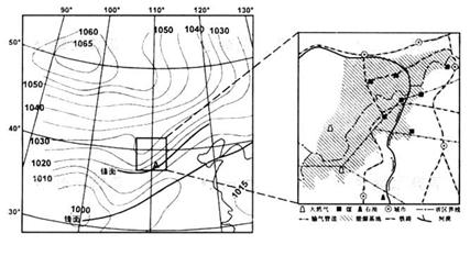 (2008年重庆卷,文综,36)图8是1月某时地面天气图(单位:百帕)。读图回答问题。