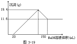 22.将一定质量的镁铝合金投入100mL一定物质的量浓度的盐酸中,合金全部溶解,向所得溶液中滴加5 mol/L的NaOH溶液到过量,生成沉淀的质量与加入的NaOH溶液的体积关系如图3-19所示。由图中数据计算