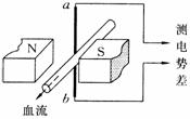 (09年宁夏卷)16. 医生做某些特殊手术时,利用电磁血流计来监测通过动脉的血流速度。电磁血流计由一对电极a和b以及磁极N和S构成,磁极间的磁场是均匀的。使用时,两电极a、b均与血管壁接触,两触点的连线、磁场方向和血流速度方向两两垂直,如图所示。由于血液中的正负离子随血流一起在磁场中运动,电极a、b之间会有微小电势差。在达到平衡时,血管内部的电场可看作是匀强电场,血液中的离子所受的电场力和磁场力的合力为零。在某次监测中,两触点的距离为3.0mm,血管壁的厚度可忽略,两触点间的电势差为160µV,磁感应强度的大小为0.040T。则血流速度的近似值和电极a、b的正负为 (