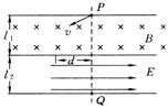 的两个毗邻的条形区域分别有匀强磁场和匀强电场,磁场方向垂直于纸面向里,电场方向与电、磁场分界线平行向右。一带正电荷的粒子以速率v从磁场区域上边界的P点斜射入磁场,然后以垂直于电、磁场分界线的方向进入电场,最后从电场边界上的Q点射出。已知PQ垂直于电场方向,粒子轨迹与电、磁场分界线的交点到PQ的距离为d。不计重力,求电场强度与磁感应强度大小之比及粒子在磁场与电场中运动时间之比。