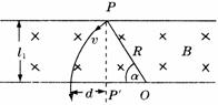 粒子在磁场中做匀速圆周运动,如图所示.由于粒子在分界线处的速度与分界线垂直,圆心O应在分界线上,OP长度即为粒子运动的圆弧的半径R.由几何关系得