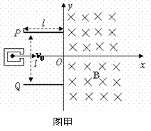 17.(09年山东卷)25.(18分)如图甲所示,建立Oxy坐标系,两平行极板P、Q垂直于y轴且关于x轴对称,极板长度和板间距均为l,第一四象限有磁场,方向垂直于Oxy平面向里。位于极板左侧的粒子源沿x轴间右连接发射质量为m、电量为+q、速度相同、重力不计的带电粒子在0~3t时间内两板间加上如图乙所示的电压(不考虑极边缘的影响)。