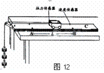 (10分)某实验小组利用拉力传感器和速度传感器探究“动能定理”,如图12,他们将拉力传感器固定在小车上,用不可伸长的细线将其通过一个定滑轮与钩码相连,用拉力传感器记录小车受到拉力的大小。在水平桌面上相距50.0cm的A、B两点各安装一个速度传感器记录小车通过A、B时的速度大小。小车中可以放置砝码。