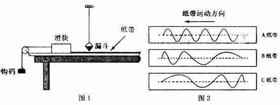 9.(08年重庆卷)某实验小组拟用如图1所示装置研究滑块的运动.实验器材有滑块、钩码、纸带、米尺、带滑轮的木板,以及由漏斗和细线组成的单摆等.实验中,滑块在钩码作用下拖动纸带做匀加速直线运动,同时单摆垂直于纸带运动方向摆动,漏斗漏出的有色液体在纸带带下留下的痕迹记录了漏斗在不同时刻的位置.