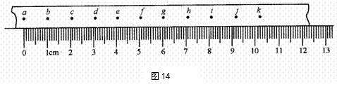 (2)某次实验得到的纸带的一段如图14所示。由图可知a点到k点的时间间隔是________s。由此可计算出纸带运动的速度大小为________m/s。若测得圆盘直径的平均值为8.00×10-2m,则可求出圆盘的角速度为_________rad/s。