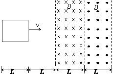 (09·崇文模拟)如图所示,为两个有界匀强磁场,磁感应强度大小均为B,方向分别垂直纸面向里和向外,磁场宽度均为L,距磁场区域的左侧L处,有一边长为L的正方形导体线框,总电阻为R,且线框平面与磁场方向垂直,现用外力F使线框以速度v匀速穿过磁场区域,以初始位置为计时起点,规定:电流沿逆时针方向时的电动势E为正,磁感线垂直纸面向里时磁通量Φ的方向为正,外力F向右为正。则以下关于线框中的磁通量Φ、感应电动势E、外力F和电功率P随时间变化的图象正确的是