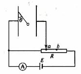 8.(09·苏苑高中模拟)竖直放置的一对平行金属板的左极板上用绝缘线悬挂了一个带正电的小球,将平行金属板按图所示的电路图连接,绝缘线与左极板的夹角为θ。当滑动变阻器R在a位置时,电流表的读数为I1,夹角为θ1当滑片在b位置时,电流表的读数为I2,夹角为θ2,则 ( D )
