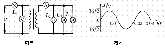 11.(徐州市2008届第一次质检)如图甲所示,变压器原副线圈的匝数比为3:1,L1、L 2、L 3、L 4为四只规格均为“9V,6W”的相同灯泡,各电表均为理想交流电表,输入端交变电压u的图象如图乙所示.则以下说法中正确的是 (BCD)