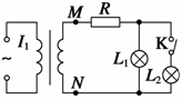 12.(济南市2008年5月质检)如图所示,理想变压器的副线圈上通过输电线接有两个相同的灯泡L1和L2,输电线的等效电阻为R。开始时,开关S断开,当S接通时,以下说法中正确的是 ( B )