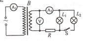 (北京西城区2008年4月抽样)图中B为理想变压器,接在原线圈上的交变电压有效值保持不变。灯泡L1和L2完全相同(阻值恒定不变),R是一个定值电阻,电压表、表流表都为理想电表。开始时开关S是闭合的。当S断开后,下列说法正确的是 ( D