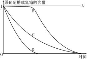 9.在用葡萄糖和乳糖作碳源的培养基上培养大肠杆菌时,若培养基中原葡萄糖(即不考虑由乳糖水解生成的葡萄糖)的含量发生了如下图曲线D所示的变化,则乳糖的含量应发生如下图中哪一曲线所示的变化? ( )