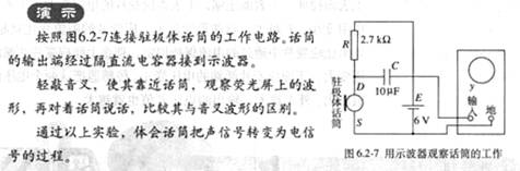 驻极体话筒的工作电路示教板,示波器,学生电源,电熨斗,日光灯起动器(若干)